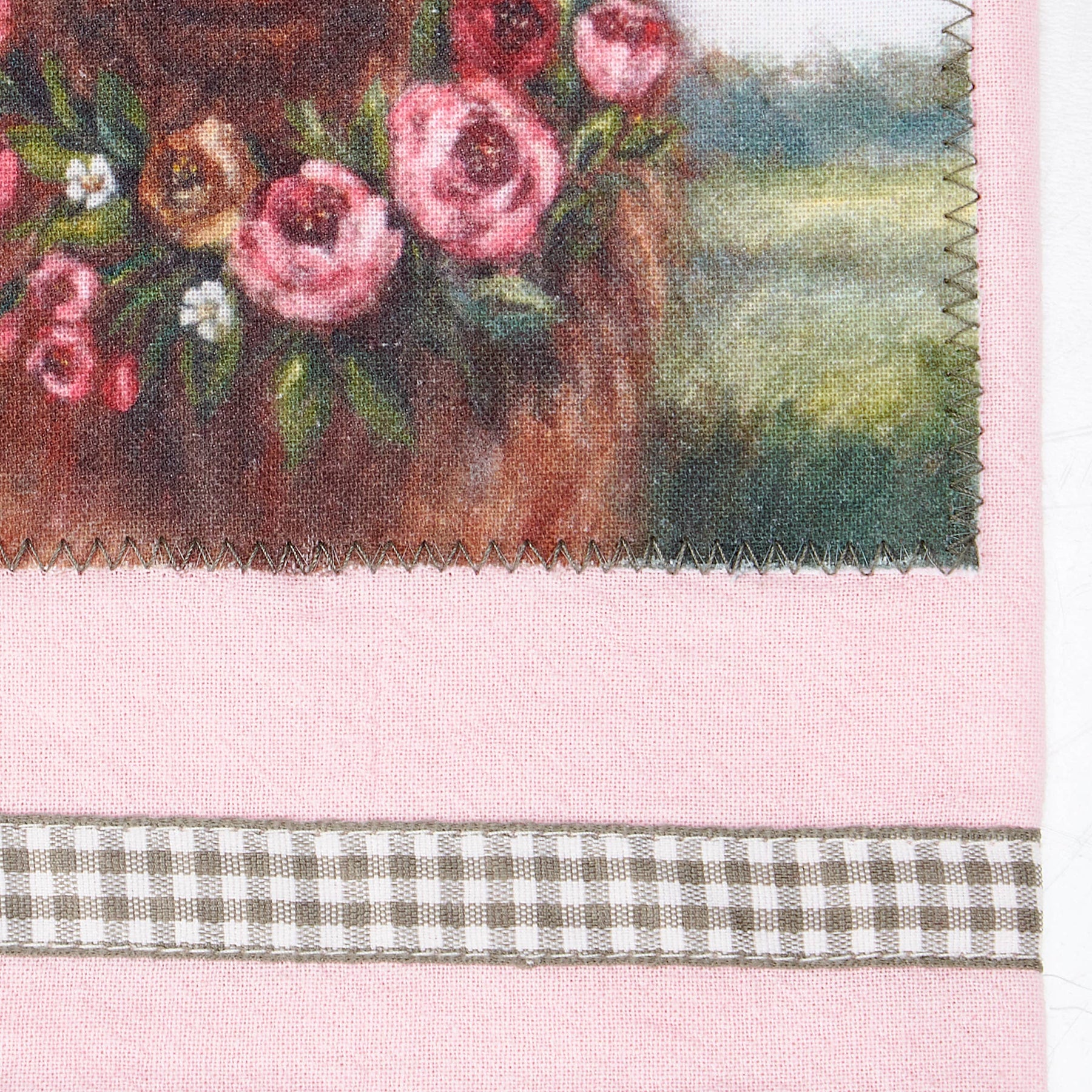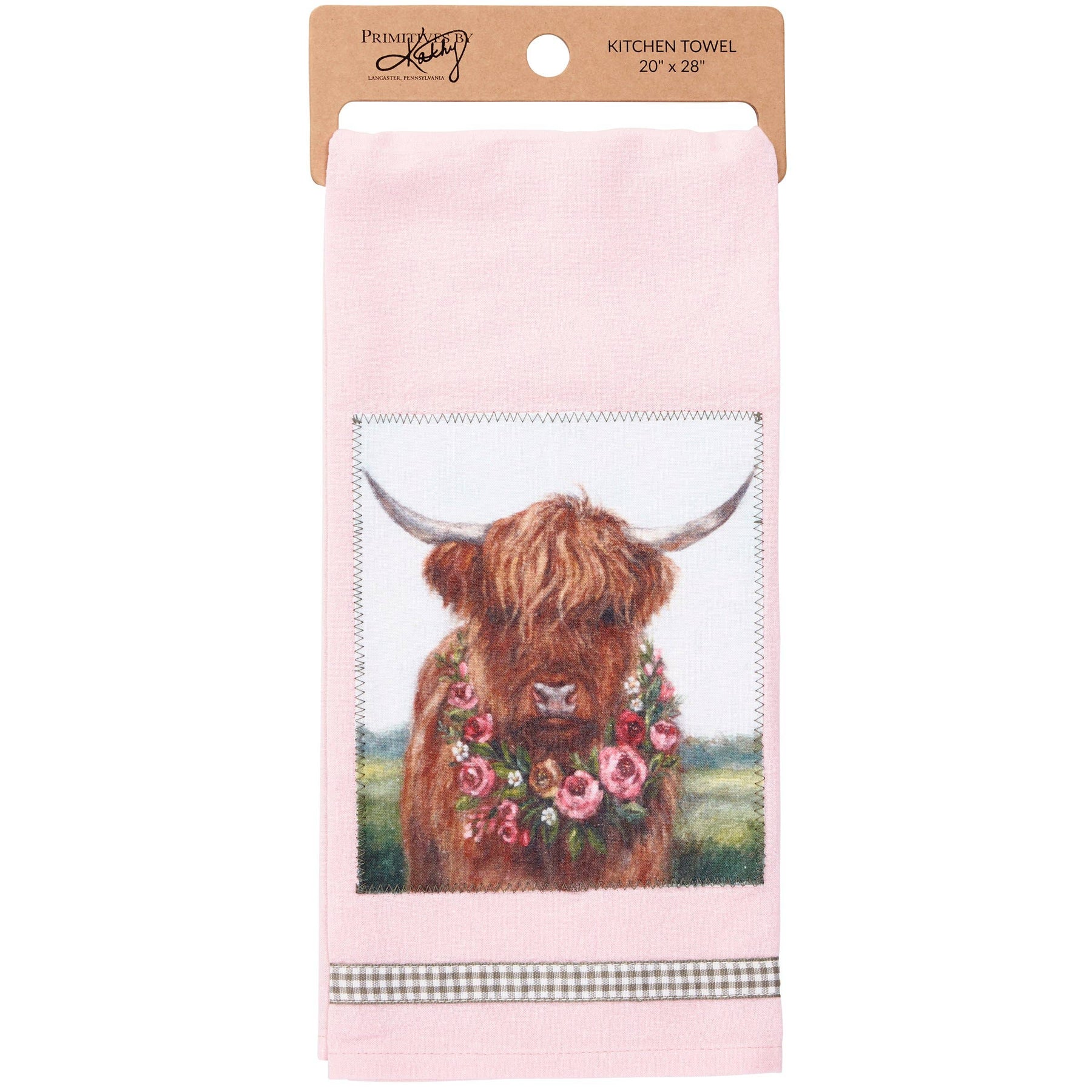 A pink cotton kitchen towel from our Easter & Spring Collection featuring a stitched art panel and gray gingham ribbon. Art panel displays a hand painted design of a highland cow wearing a wreath of vibrant spring flowers. Design is replicated from original artwork painted onto burlap canvas, giving the art a unique depth and texture. Our Floral Cow kitchen towel is machine-washable for convenient cleaning. Packaged on a cardboard hanger with hole to easily hang on rack. A charming spring-themed kitchen accessory perfect for everyday use.